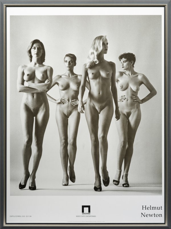 Offset/Papier. Plakat für die Helmut-Newton-Ausstellung im Castello di Rivoli Museo d'Arte Contemporanea 1994. Die Fotografie aus der Serie "Big Nudes" schuf Newton zusammen mit dem Gegenstück der bekleideten Models ("Dressed") bei seiner Arbeit für die "Vogue", Paris, November 1981. Blatt ca. 133,5 cm x 100 cm. Rahmen.