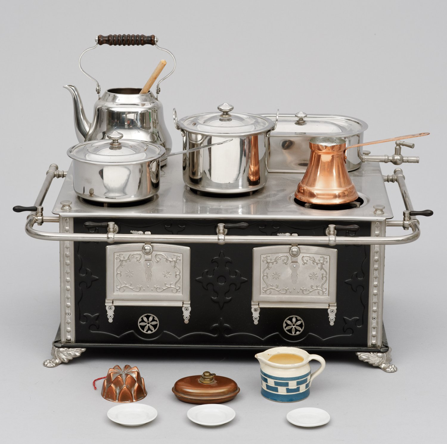 Metall, Holz. 5-tlg.; Herd, 2 Töpfe, Kessel, Wasserschiff. Auf vier Tatzenfüßen rechteckiger Ofenkorpus mit zwei frontseitigen Öffnungen und fünf Kochstellen. Rundes bzw. ovales Kochgeschirr, teilw. mit Deckel. Art.-Nr. 1601. Beigabe: 4 Tellerchen, Krug, Heißmilchkännchen, Wärmflasche, Puddingform, Holzlöffel, Topflappen und Küchenhandtuch in ähnlichem Miniaturformat. H. 20 cm. 45 cm x 32 cm. Topf-/Kessel-H. 7 cm - 16,5 cm.
