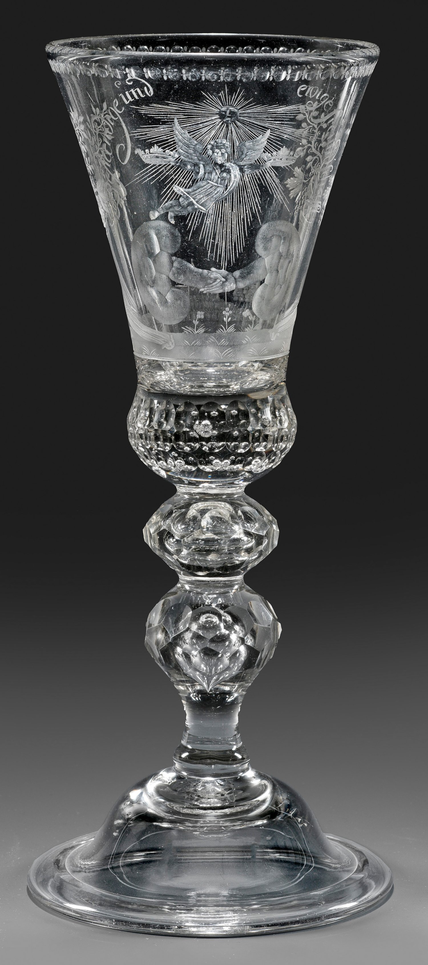 Glockenfuß, umgeschlagener Rand, Balusterschaft und gebauchter Ansatz der Kuppa wabenfacettiert bzw. mit flächendeckendem Kuppelschiff sowie eingestochenen Luftblasen. Feiner, teilw. geblänkter Schiff- und Schnittdekor, schauseitig allegorische Darstellung eines vor der strahlenden Sonne fliegenden Engels, der zwei Kronen über sich vereinigende Hände hält, flankiert von zwei Füllhörnern, oberhalb Inschrift mit Devise "Bestaendige und ewige freundschaft". H. 23,5 cm.