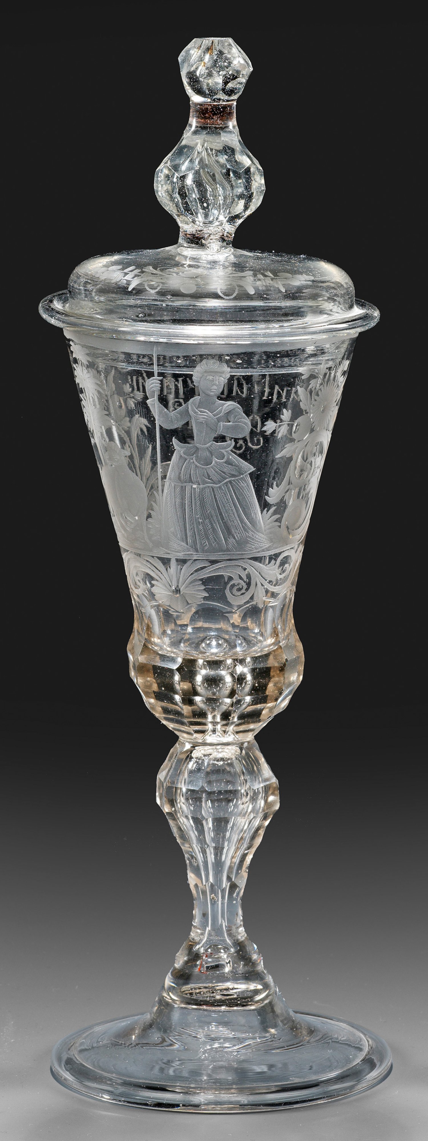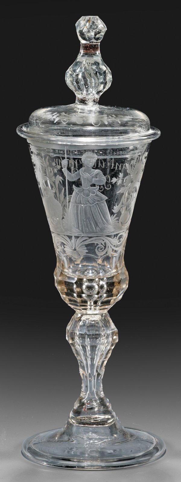 Farbloses Glas, geschliffen. Glockenförmig ansteigender Fuß mit umgeschlagenem Rand, im wabenfacettierten Balusterschaft und gebauchten Ansatz der Kuppa große eingestochene Luftblase, Haubendeckel mit korrespondierend wabenfacettiertem Knauf. Auf der Kuppa geschnittener Dekor aus stehender Schäferin mit einem Schaf, umrahmt von Blatt- und Blütenranken, rücks. humorvoller Sinnspruch "Eines zu weiden ist woll vergunt, aber mehr ist ungesundt". H. 25,5 cm.