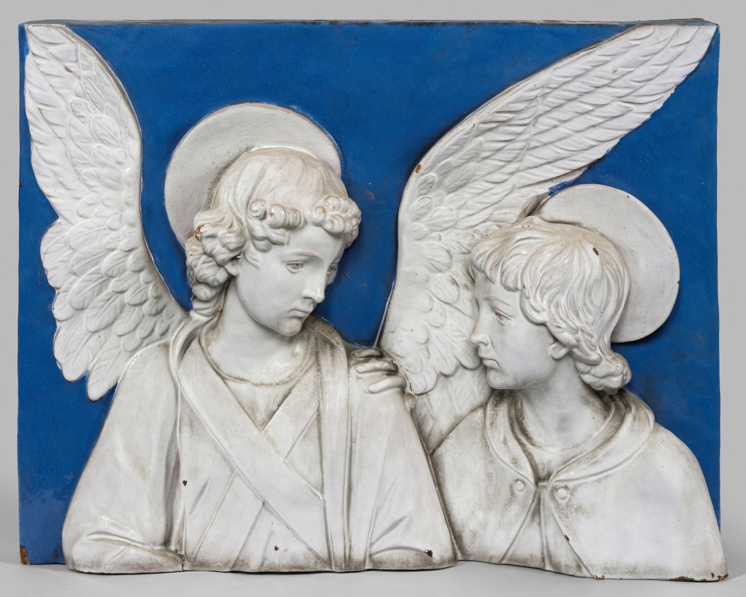 After Andrea della Robbia (1435 - 1525). An Italian probably Florentine 19th century light blue and white glazed maiolica wall relief depicting Tobias and the Archangel Rapael. After the well-known maiolica altarpiece by Andrea della Robbia in the Basilica Santa Croce in Florence. Minor glaze chips.