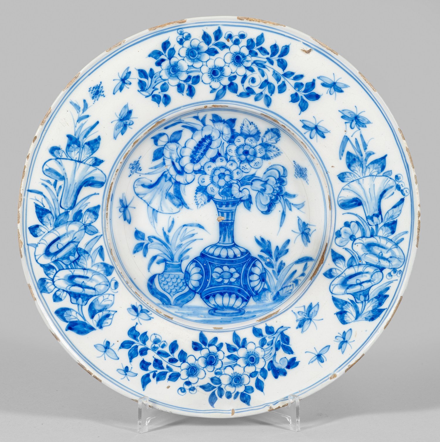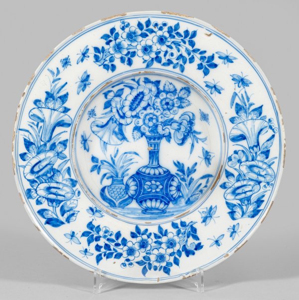 Fayence. Runde Form mit vertieftem Spiegel, breiter, horizontaler Fahne und leicht profiliertem Rand. Kobaltblauer Scharffeuerdekor, im Spiegel ein Blumenvasen-Stillleben, auf der Fahne vier größere florale Motive, dazwischen gestreute Insekten. Christie's-Etikett mit Dat. 5.12.(19)94 u. Nr. 369. D. 36 cm.