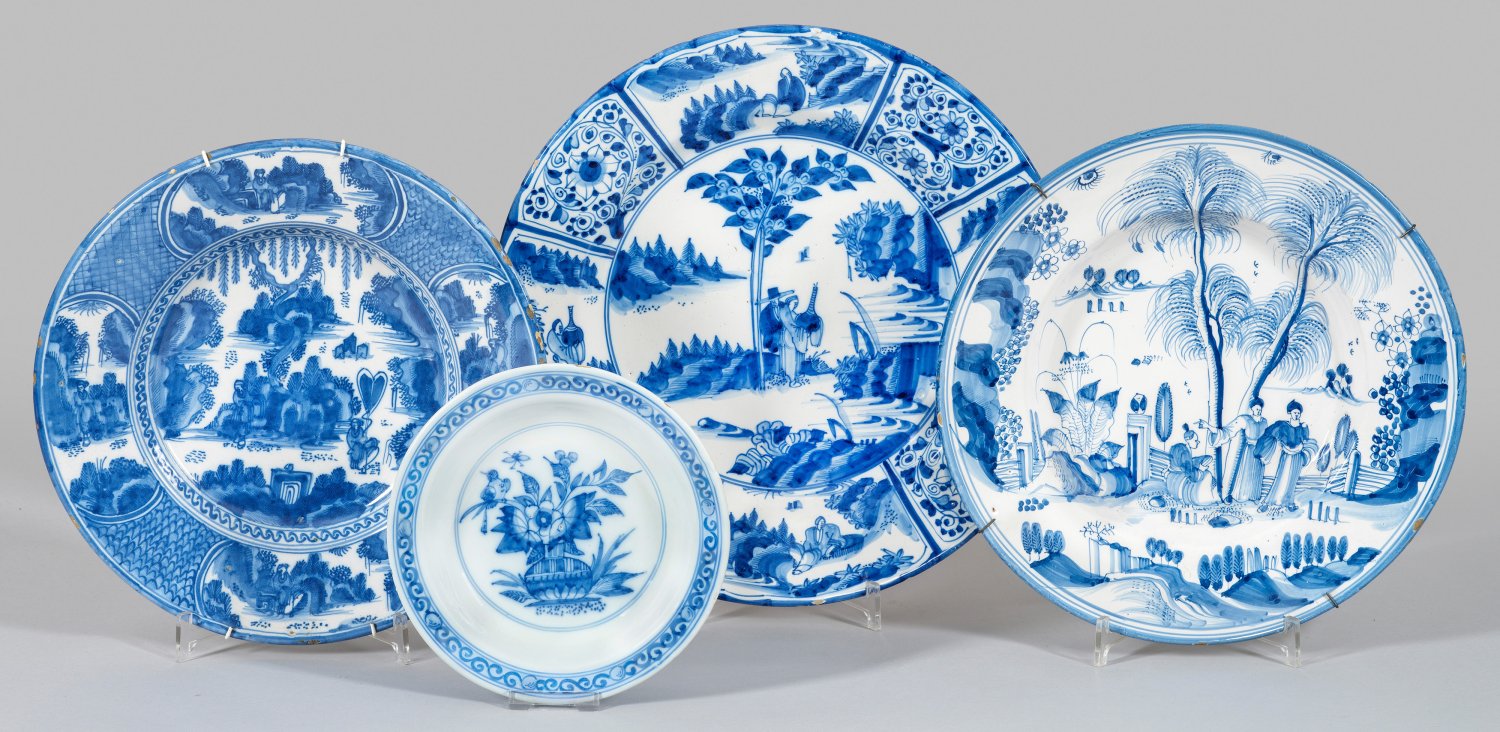 Fayence. Unterschiedliche Größen und Dekore in kobaltblauer Scharffeuermalerei aus Chinoiserien und Ornamenten, ein kleiner Teller mit Blumenvase im chinesischen Stil. Großer Teller (bzw. Platte) mit chinesischen Figuren unter Palmen mit Etikett der Fayence-Ausstellung im Kunstgewerbemuseum Köln 1938, Kat. Nr. 8. Minim. Glasurchips am Rand, kleiner Teller rest.; D. 21 cm-37,5 cm.