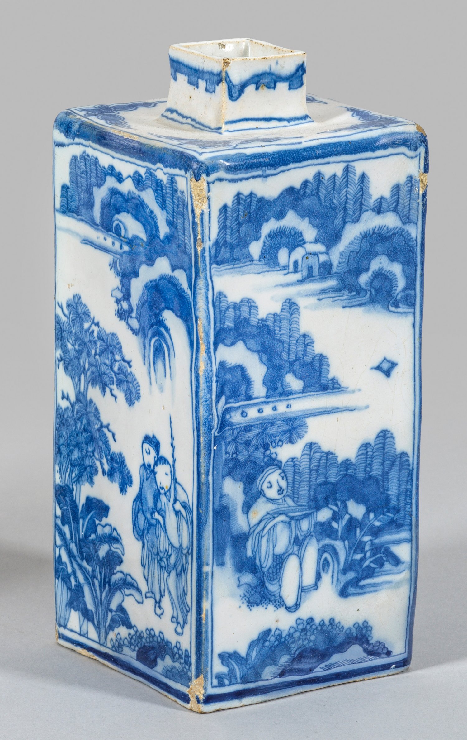 Fayence. Quadratischer Querschnitt und kurzer Hals. Allseitig flächendeckender, kobaltblau gemalter Scharffeuerdekor mit chinesischen Figuren in Landschaften, auf der Schulter vier gleichartige Ornamentmotive. Am Boden Ausstellungsetikett "KERAMOS 1979" mit Nr. XIII/54. H. 20 cm.