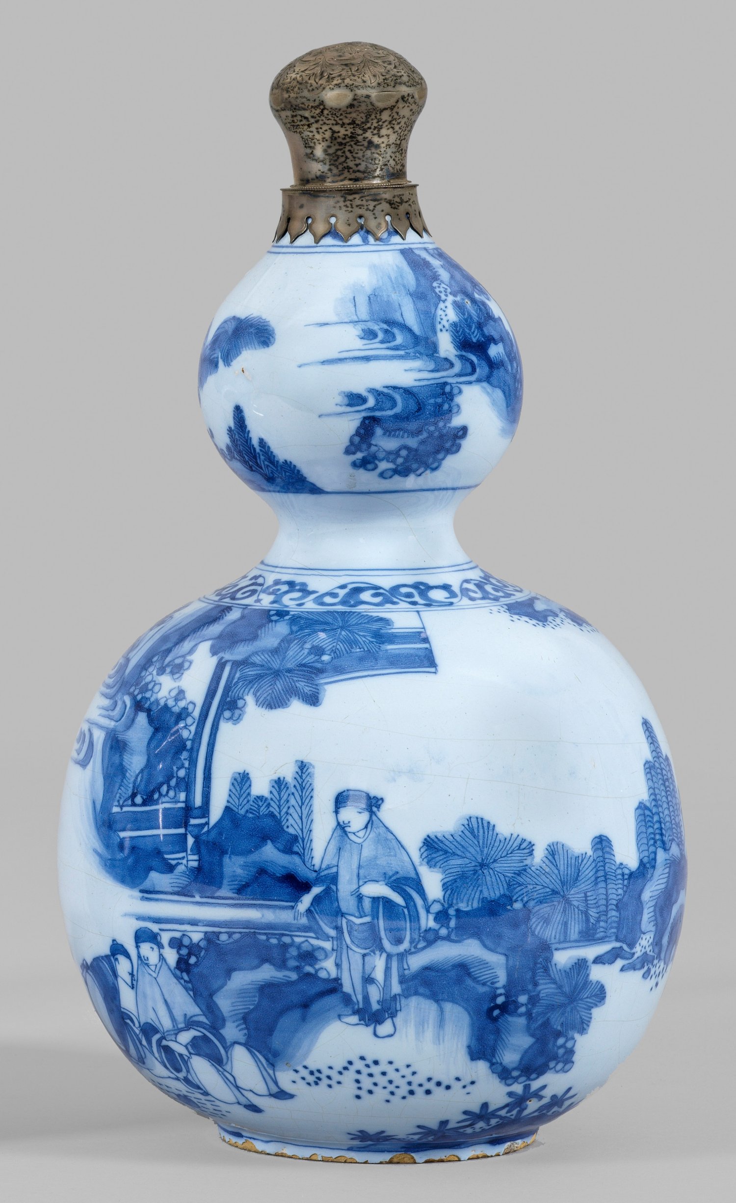 Fayence, hellkleisterblaue Glasur. Doppelkürbisform. Flächendeckender kobaltblauer Dekor aus zwei umlaufenden Darstellungen mit chinesischen Figuren in Landschaften, an Schulter und Hals Ornamentbänder. Silbermontierte Mündung, bekrönt von einem scharniertem, hochgezogenem Stopfen, unterhalb dekoriert durch herabhängende Spitzenbordüre, auf der Stopfenoberseite fein gravierter Lambrequindekor mit Blüten im Zentrum, undeutl. gem.; Glasur am Standring unw. best.; Stopfen leicht gedellt. Etiketten der Slg. Schafft mit Nr. 33 und von Christie's. H. 33 cm.