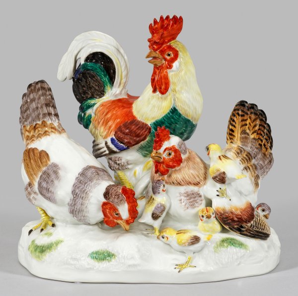 Auf ovalem Natursockel dargestellte Hühnerschar aus Hahn, Hennen und Küken mit farbenprächtigem Federkleid. Feine polychrome Malerei. Entw. August Ringler. Modell-Nr. 77291. Schwertermarke. H. 21,5 cm. B. 22 cm.