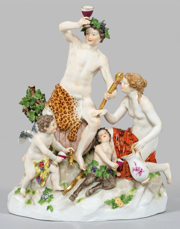 Hoher, naturalistisch gestalteter Felssockel mit aufgelegten Blüten und Weinrebe. Auf einem Weinfass sitzender, von Weinlaub bekränzter und in ein Leopardenfell gehüllter Bacchus, mit der erhobenen linken Hand einen Weinpokal emporhaltend. In der Rechten ein Zepter tragend. Zu seinen Füßen trinkender Satyrknabe bzw. geflügelte Amorette. Seitlich hockende Bacchantin mit einem Henkelkrug. Polychrome Malerei mit wenig Goldstaffage. Entw. Ernst August Leuteritz. Modell-Nr. C 35x. Minim. best./rest.; Schwertermarke. H. 33 cm.