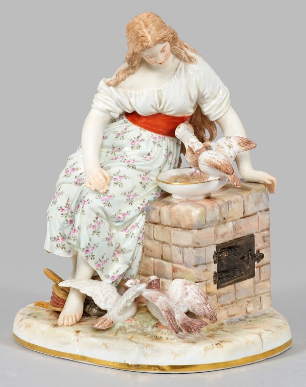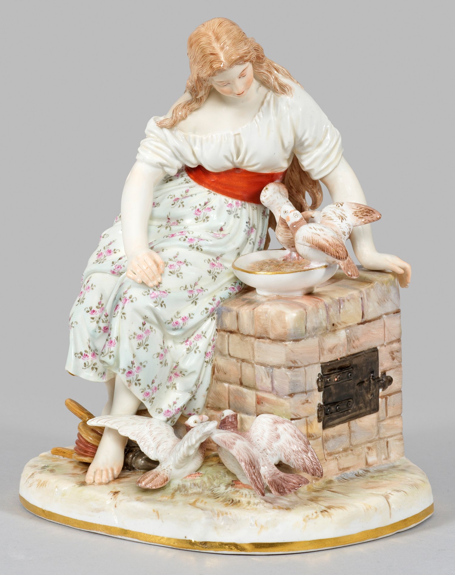 A porcelain figure of Cinderella feeding the doves. Insignificantly restored. Crossed swords mark.