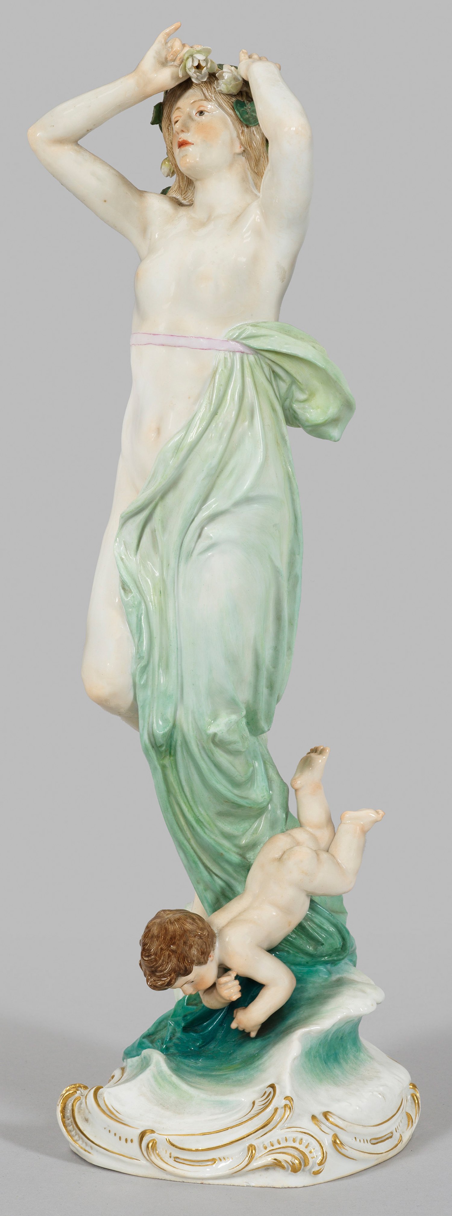 Über rocaillefömig geschweiftem Ovalsockel aus einer schäumenden Meereswoge aufsteigende Göttin Venus als Halbakt in hauchzartem, ihren Körper umschmiegendem Gewand, den aus Seerosenblüten und Blättern verzierten Kopfschmuck richtend. Zu ihren Füßen ein nackter Knabe schwebend. Polychrome Malerei mit Goldstaffage. Entw. Friedrich Offermann, 1898. Modell-Nr. R 124. Minim. best./rest.; Schwertermarke. H. 36 cm.