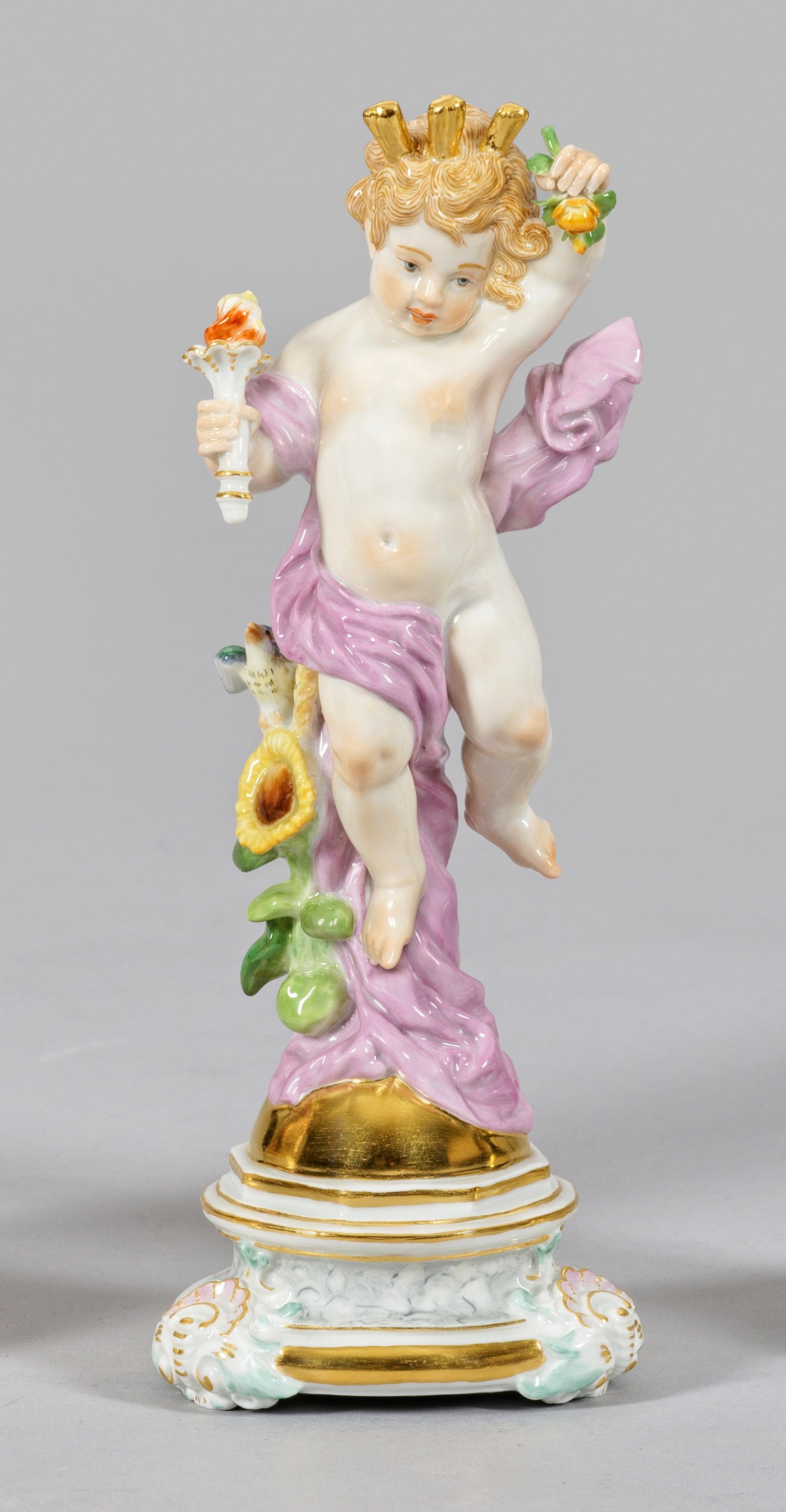 Runder, eingezogener, teilw. marmorierter Sockel mit drei reliefierten Muschelkonsolen. Auf oktogonaler Basis mit vergoldeter Halbkugel stehender Putto mit Strahlenkrone und rosafarbenem Umhang unweit einer Sonnenblume, eine Fackel bzw. Rosen haltend, den Tag symbolisierend. Polychrome Malerei mit Goldstaffage. Entw. Heinrich Schwabe. Modell-Nr. 70706. Aus der Edition "SinnBilder". Limitierung "16/50". Zertifikat. Schwertermarke. H. 18,5 cm.