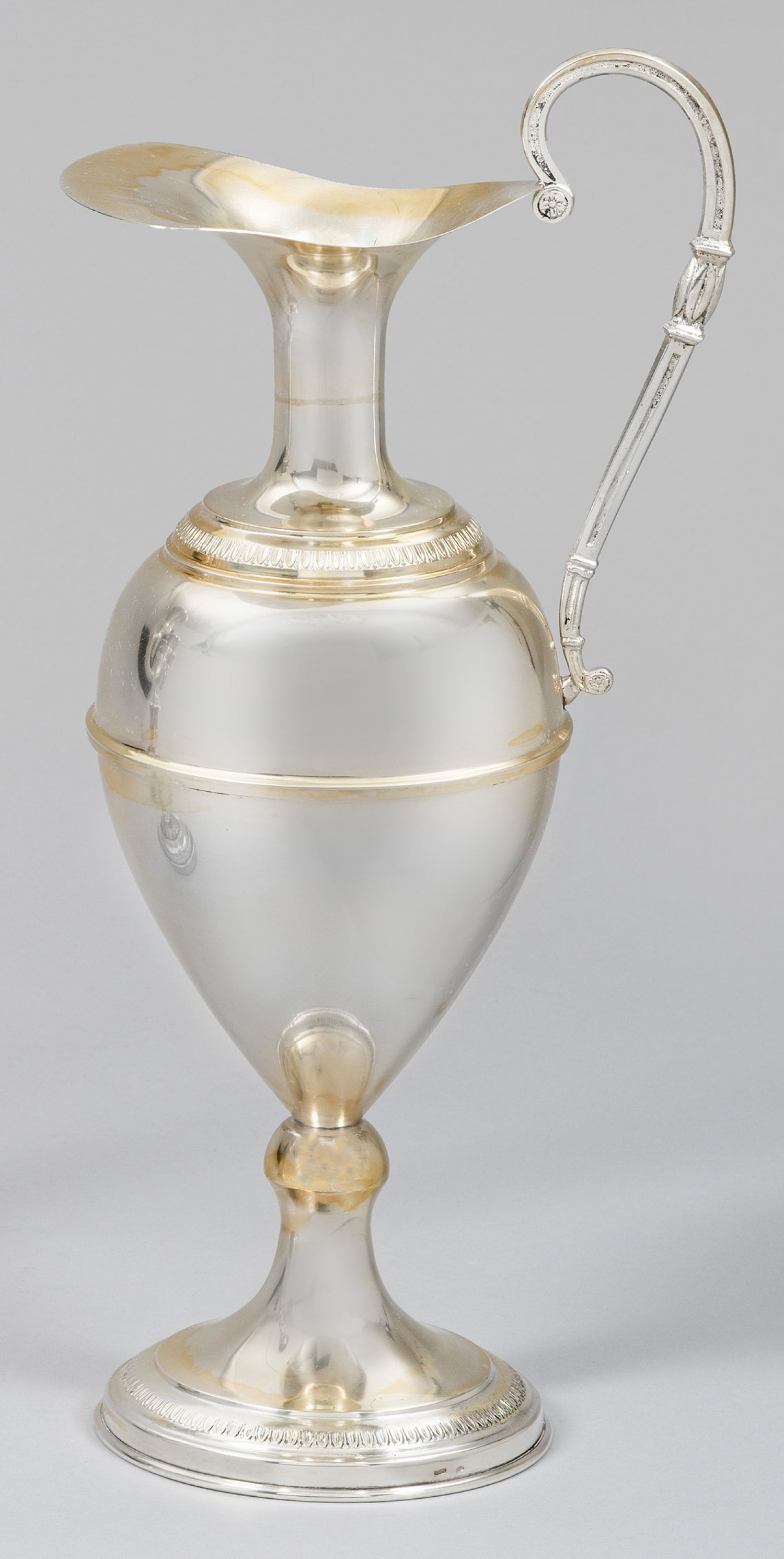 Silber, beschwert. Über Rundfuß eingezogener Schaft mit Kugelnodus und ovoider, mittig profilierter Korpus. Breit ausschwingender Ausguss, rückseitig schmaler, ornamentaler Schwanenhalshenkel. Glatte Wandung. Schulter und Stand umzogen mit Blattbordüre. Gest. 800, Beschauzeichen mit Herstellernummer "193". Gew. ca. 930 g. H. 37,5 cm.