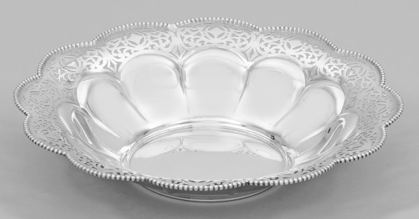 Silber. Flacher, runder Spiegel und breite, blütenförmig ausschwingende, am Rand durchbrochen gearbeitete Fahne gesäumt von Perlstabdekor. Gest. 800, Herstellerzeichen. Gew. ca. 540 g. H. 6,5 cm. D. 32,5 cm.
