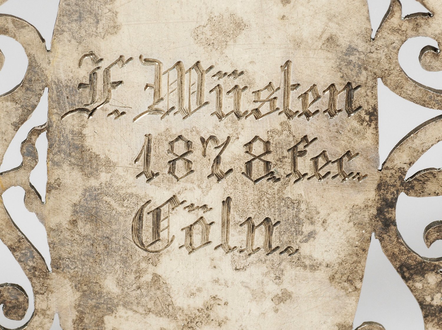 Georg Freiherr von Eerde (1825-1890) war preußischer Verwaltungsbeamter, Mitglied der katholischen Deutschen Zentrumspartei und bis zu seiner Amtsenthebung 1876 im Zuge des Kulturkampfes Otto von Bismarcks gegen den Einfluss der katholischen Kirche im Deutschen Kaiserreich Landrat des niederrheinischen Kreises Geldern. Zu seiner Verabschiedung aus dem Amt erhielt er 1878 ebendiesen, vom päpstlichen Goldschmied und königlichen Hoflieferanten Franz Wüsten (1843-1893) gefertigten Tafelaufsatz, der in der Literatur als verschollen galt ("The Art Loss Register"-Zertifikat vom 17.02.2025, Ref.: S00252602, liegt vor.).
