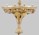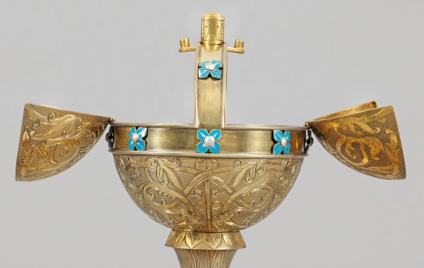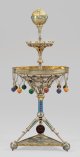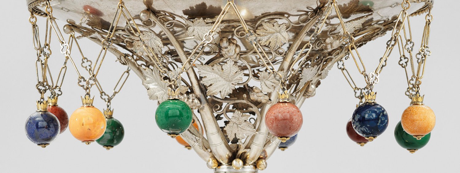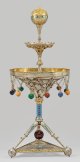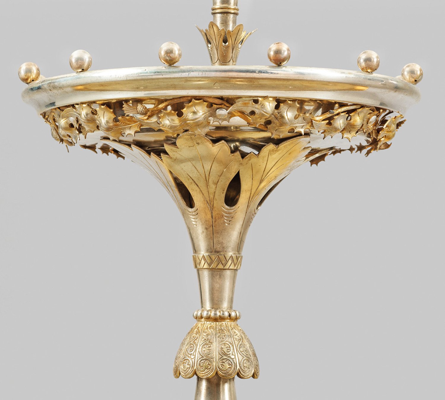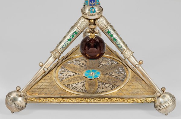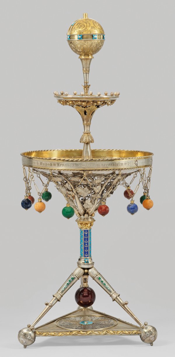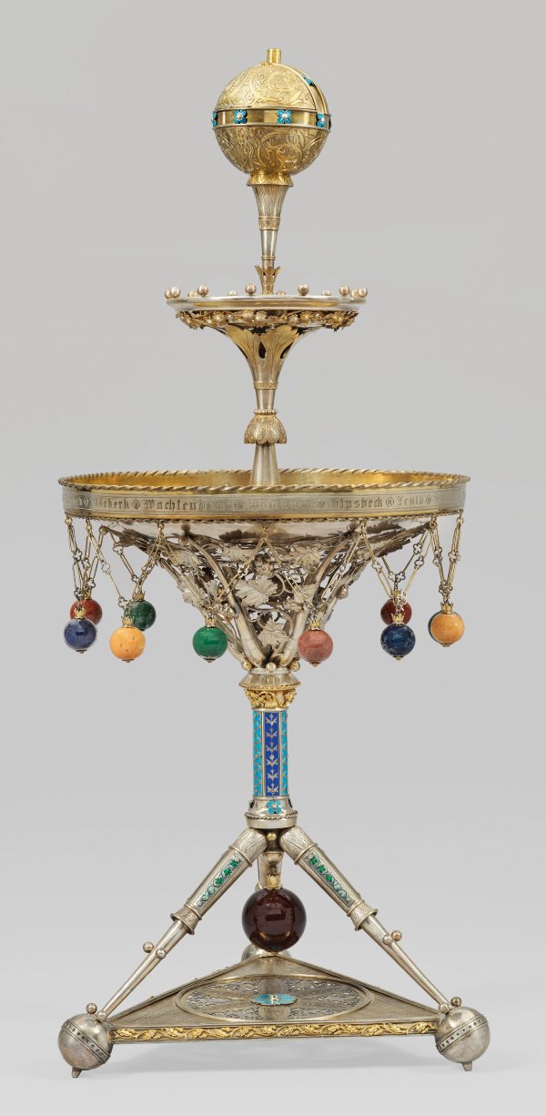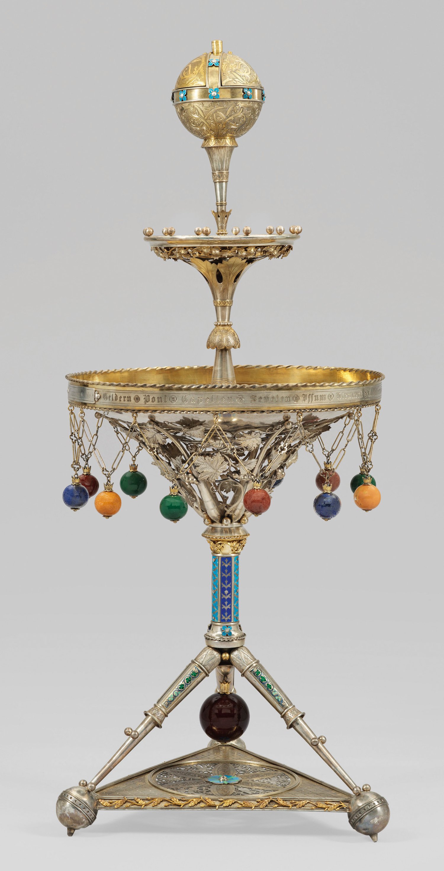 Silber, teilw. vergoldet und emailliert, sowie Glas. Mehrstufiger Aufbau mit dreischenkeligem Stand über ausgestellten Kugelfüßen. Dreieckige Sockelplatte mittig in Form einer Blütenrosette ornamentiert durchbrochen gearbeitet. Unter dem kurzen, zylindrischen Schaft an einer Öse befestigte, große, rote Glaskugel. Über plastisch gearbeiteten Weinreben und -ranken mit fein reliefiertem Weinlaub eine flache, große Schale mit zylindrisch aufgestelltem, von Kordelbändern umzogenem Rand. Schauseitig eine applizierte Plakette mit Widmung "Georg von Eerde", dat. "1877" sowie umlaufend die Namen der 16 Bürgermeistereien des niederrheinischen Kreises Geldern von 1816 Geldern, Pont, Kapellen, Sevelen, Issum, Nieukerk, Aldekerk, Wachtendonk, Wankum, Hinsbeck, Leuth, Straelen, Walbeck, Kevelaer, Weeze, Kervenheim. Am unteren Rand eine befestigte Kette mit 12 kleinen ockerfarbenen, rostroten, schwarzen, dunkelgrünen sowie lapislazulifarbenen Glaskugeln. Mittig aufsteigender, konischer Schaft in stilisierten Blättern als Träger für eine weitere, kleinere Schale endend. Als Bekrönung eine zweifach scharnierte, seitlich aufklappbare Kugel. Die Wandung verziert mit gravierten Voluten und Blattranken. Schalen, Schaft und Stand umzogen von vergoldeten Eichenblatt- und Distelranken sowie akzentuiert mit zarter, polychromer Emaillemalerei in Form von Blüten, Blattranken und Ornamenten. Minim. best.; Gravierte Signatur "F. Wüsten, 1878 fec. Cöln". Gew. ca. 4720 g. H. 91 cm.
