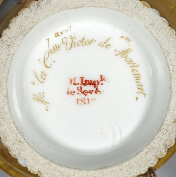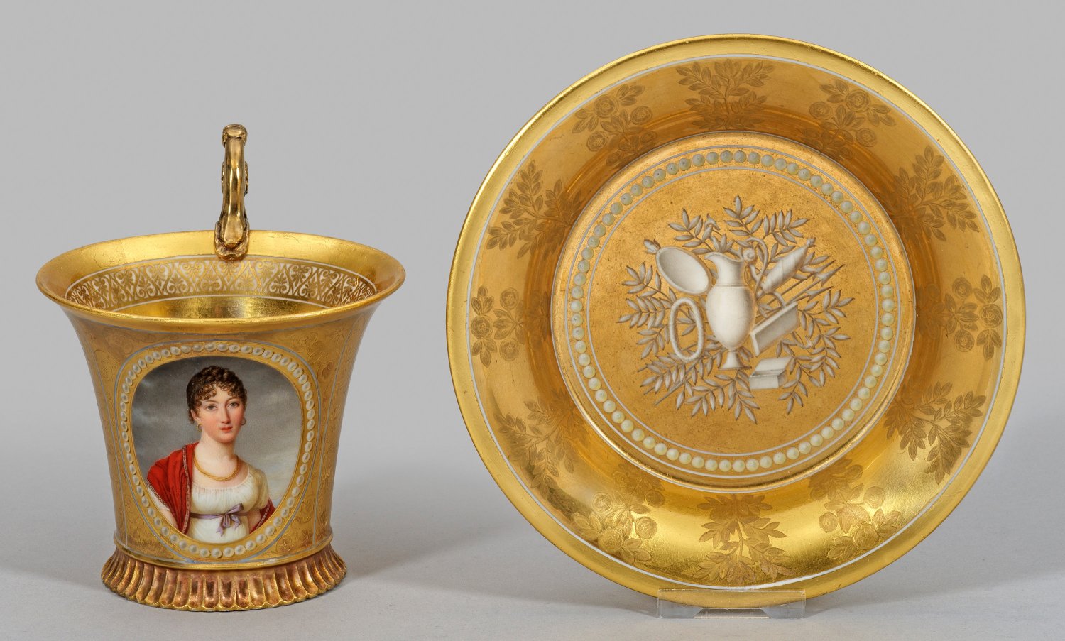 mit Untertasse. Über dem kannelierten Fußring kelchförmig sich erweiternder Korpus mit hochgezogenem, volutenförmigen Schlangenhenkel. Sog. "tasse Jasmin à pied cannelé". Zentral der Wandung im ovalen, von einem Perlband umzogenen Medaillon, das Brustbildnis wohl von Joséphine de Beauharnais (1763 - 1814), Frau Napoleons, Kaiserin von Frankreich, vor wolkenbehangenem Fond. Seitlich der Wandung blumenbekränzte Musikinstrumente wie Harfe und Leier. Flächendeckender, vollvergoldeter Fond mit Reliefgold. Ornamentband in der Innenwandung. Feine polychrome Malerei. In Gold im Boden bez. "M e la C esse Victor de Mortmeart". Rest.; Manufakturmarke. H. 12 cm. Untertassen-D. 16 cm.