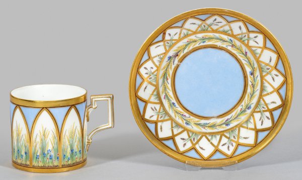 mit schräg ansteigender Unterschale. Konische Form "Antikglatt" mit Henkel à la grecque. Taubenblauer Teilfond. Umlaufend auf der Wandung sowie auf der Fahne von architektonischen Arkadenbögen gegliederte Wiesenlandschaft mit Kornähren und Feldblumen "en terrasse", in feiner polychromer Malerei mit reicher Goldstaffage. Maler-Nr. 85. Zepter- und Malereimarke. Unw. rest.; Äußerst minim. best./ber.; Tassen-H. 6 cm. Untertassen-D. 13 cm.