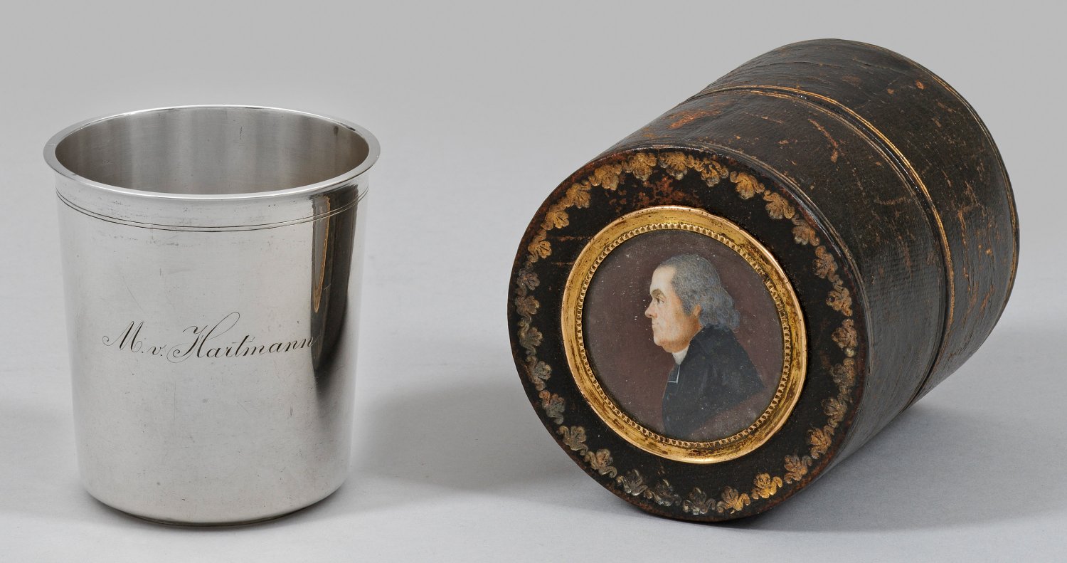 Silber. Leder und Glas. Zylindrischer Becher mit profiliertem, leicht ausgestelltem Rand und schauseitiger Inschrift "M. v. Hartmann", wohl für Wilhelmine (Minna) von Hartmann. Futteral zylindrisch, mit goldenen Profillinien. Auf dem Deckel die runde Miniatur eines Mannes im Profil. Monogr. "D.P." Gest. 13 Lot. Becher-Gew. ca. 100 g. Ges.-H. 9 cm.