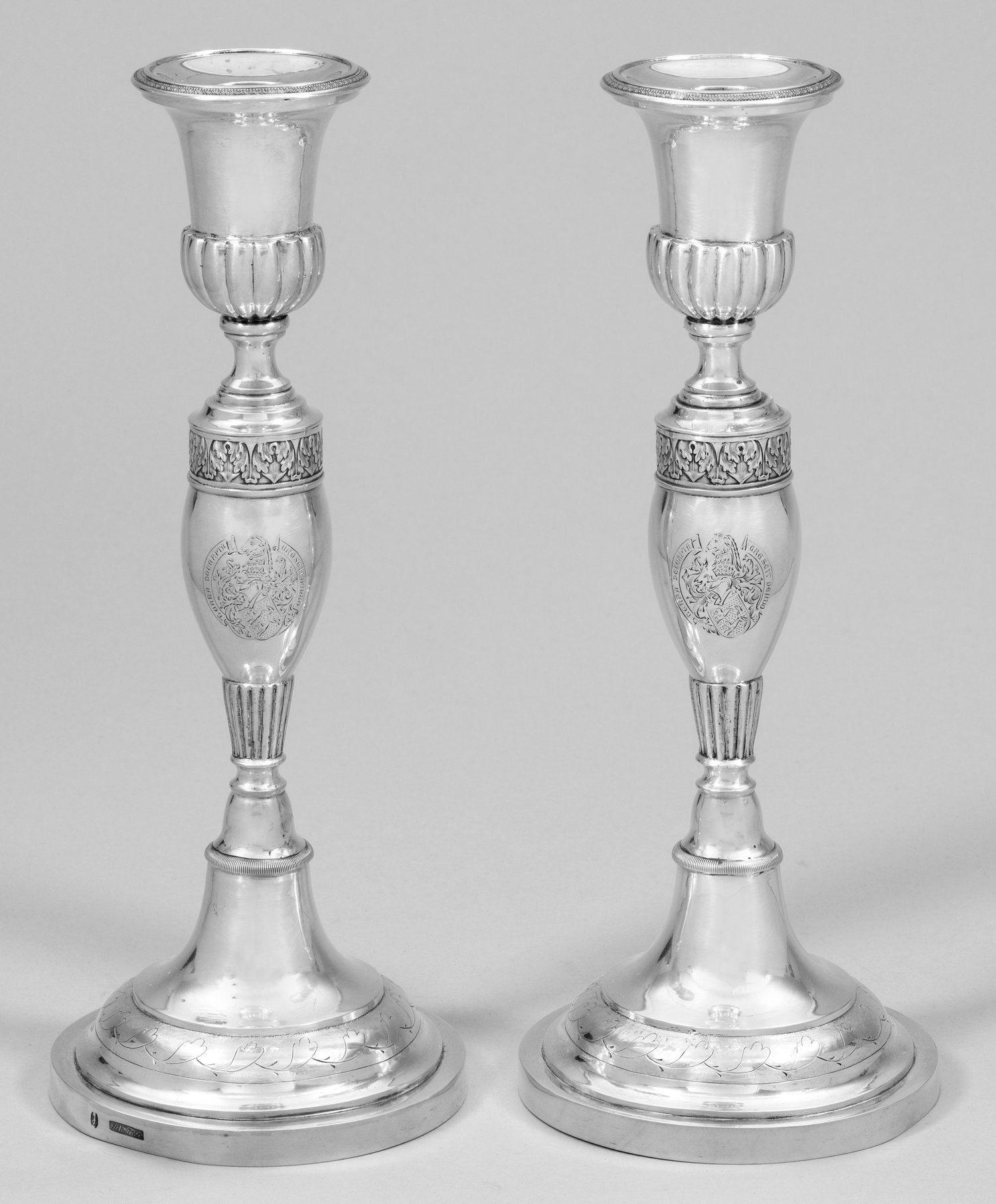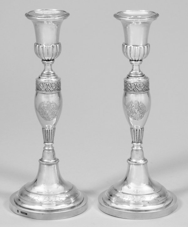 Lot 44: Paar Biedermeier-Kerzenleuchter mit Wappengravur