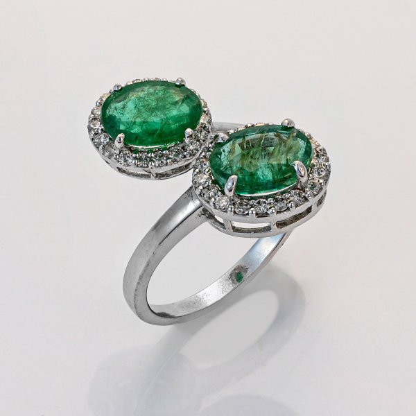 Ring set with 2 emeralds approx. 2,00 ct. and diamonds approx. 0,64 ct., in 18 k white gold.