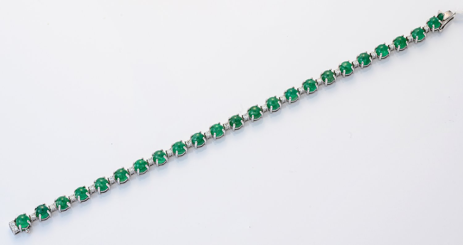 Weißgold, gest. 585. Linear besetzt mit Smaragdcabochons von zus. ca. 13 ct. und Brillanten von zus. ca. 0,80 ct., Gew. ca. 14,08 g.