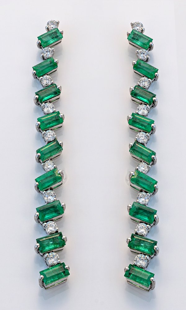 Pair of earrings set with emeralds approx. 2,60 ct. and diamonds approx. 0,70 ct. (G/vsi), in 18 k white gold.