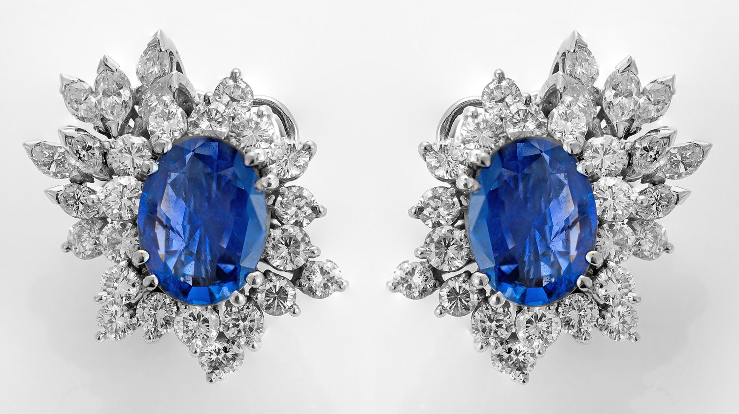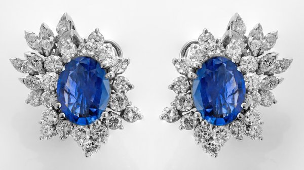 Pair of earclips set with royal blue sapphires approx. 5,80 ct. and 7,50 ct. (no indication of heating), diamonds approx. 5,20 ct. and 2,00 ct. (H/vvs-vs), in 18 k white gold. Certificate included.