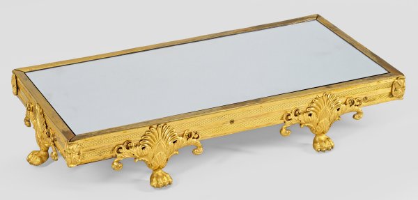 Bronze, fein ziseliert und feuervergoldet sowie Spiegelglas. Gerader, querrechteckig angelegter Korpus, umlaufend mit schmalen Relieffriesen und applizierten Rosetten auf den Ecken mit eingelegter, erg. Spiegelfläche. Reliefplastische Tatzenfüße mit großen, reliefplastischen Palmetten und Blattwerk. H. 10 cm. 52 cm x 26 cm.