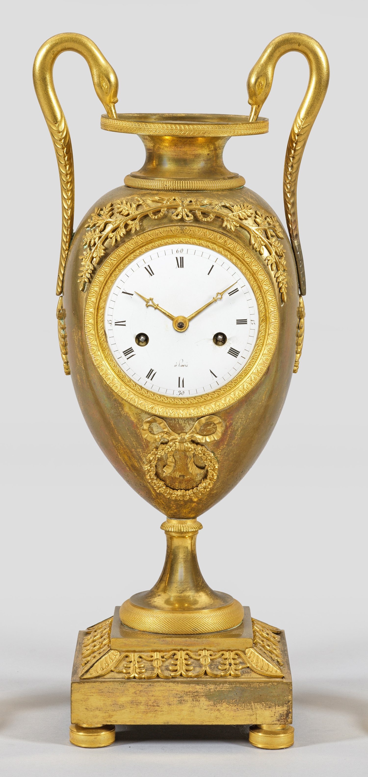 Bronze, vergoldet. Über quadratischem Sockel mit erhaben reliefierten Palmetten balusterförmiger Korpus mit stark geschwungenen Schwanenhenkeln. Profilgerahmtes, unw. besch. Emailzifferblatt bez. à Paris. Pendulenwerk mit Fadenaufhängung sowie Halbstundenschlag auf Glocke. Vergoldung abgerieben. H. 40 cm.