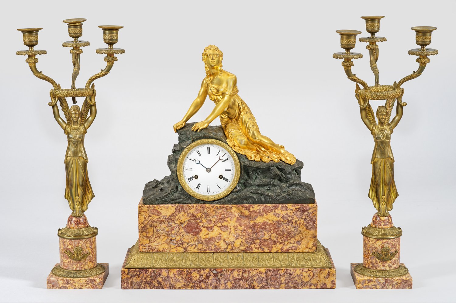 3-tlg.; Uhr und Paar Girandolen. Violettfarben und gelb gemaserter Marmor sowie Bronze, teilw. vergoldet und dunkel patiniert. Über querrechteckig angelegtem Sockel mit Palmettenfries. Oberhalb naturalistisch gestaltetes Gehäuse mit figuraler Bekrönung. Emailzifferblatt, unw. besch.; Pendulenwerk mit Fadenaufhängung. Pendel und Glocke fehlen. Paar 3-flg. Girandolen mit Viktorien. Uhren-H. 44 cm. 39 cm x 14 cm. Leuchter-H. 47 cm.
