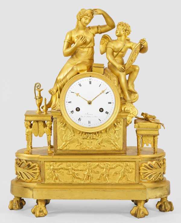Bronze, fein ziseliert sowie vergoldet. Vollplastische Darstellung einer jungen Frau und eines Amorknaben mit Spiegel auf dem Uhrengehäuse sitzend. Dazwischen aufklappbare Schatulle mit Flakons. Unter ihnen gekantetes Podest mit erhaben reliefierten Chimären sowie querrechteckig angelegter, seitlich abgerundeter Sockel mit Puttenfries auf Klauenfüßen. Profilgerahmtes Emailzifferblatt, bez. "Fervez Rue de L'odéon à Paris". Pendulenwerk mit Fadenaufhängung sowie Halbstundenschlag auf Glocke. H. 48 cm. 39 cm x 14 cm.