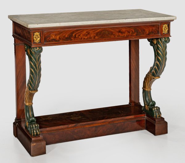 Mahagoni, furniert sowie Holz, grün gefasst und teilw. vergoldet. Über gekanteter Sockelplatte stark geschwungene, blattreliefierte Streben mit Tatzenfüßen sowie flache Pilaster als Träger für profilierte Zarge mit reliefierten Rosettenmotiven. Gering überstehende Deckplatte aus weißem, hellgrau gemasertem Marmor. H. 92 cm. 121 cm x 46,5 cm.