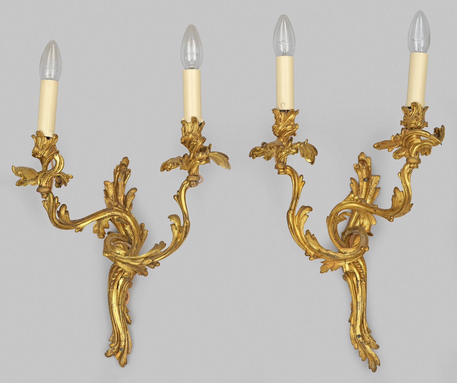 Gegenstücke. 2-flg.; Bronze, vergoldet. Schlankes Wandschild aus gestrecktem Blattwerk, in stark geschwungene, korrespondierende Leuchterarme mit vasenförmigen Tüllen über großen Traufschalen übergehend. Nachträglich Elektrifiziert. Ges.-H. 58 cm.