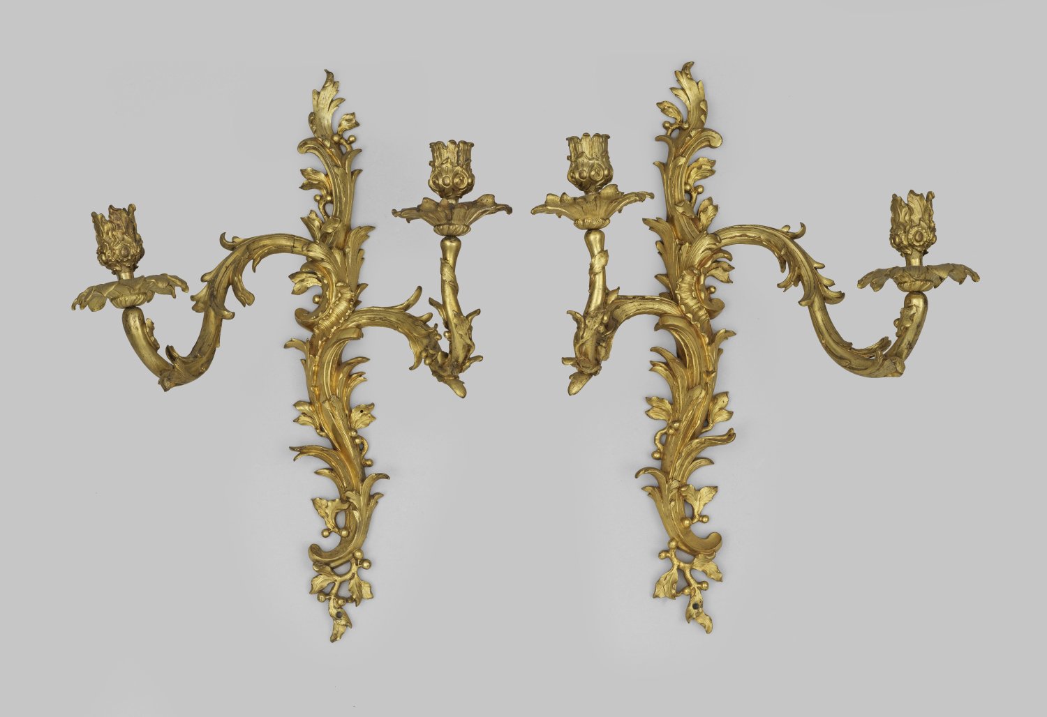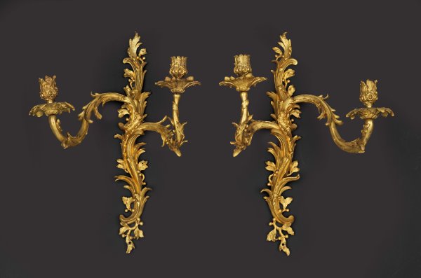 Gegenstücke. 2-flg.; Bronze, fein ziseliert und feuervergoldet. Schmales, gestrecktes Wandschild aus gegeneinander gestellten Volutenmotiven, Rocaillen sowie Blattwerk und Fruchtkugeln, in korrespondierende, stark geschwungene und versetzt angeordnete Leuchterarme übergehend. Unterschiedliche, vasenförmige Tüllen über großen, blütenförmigen Traufschalen. Bronzeelemente teilw. mit sog. Couronné-Stempel in Form eines gekrönten C; H. 46,5 cm.