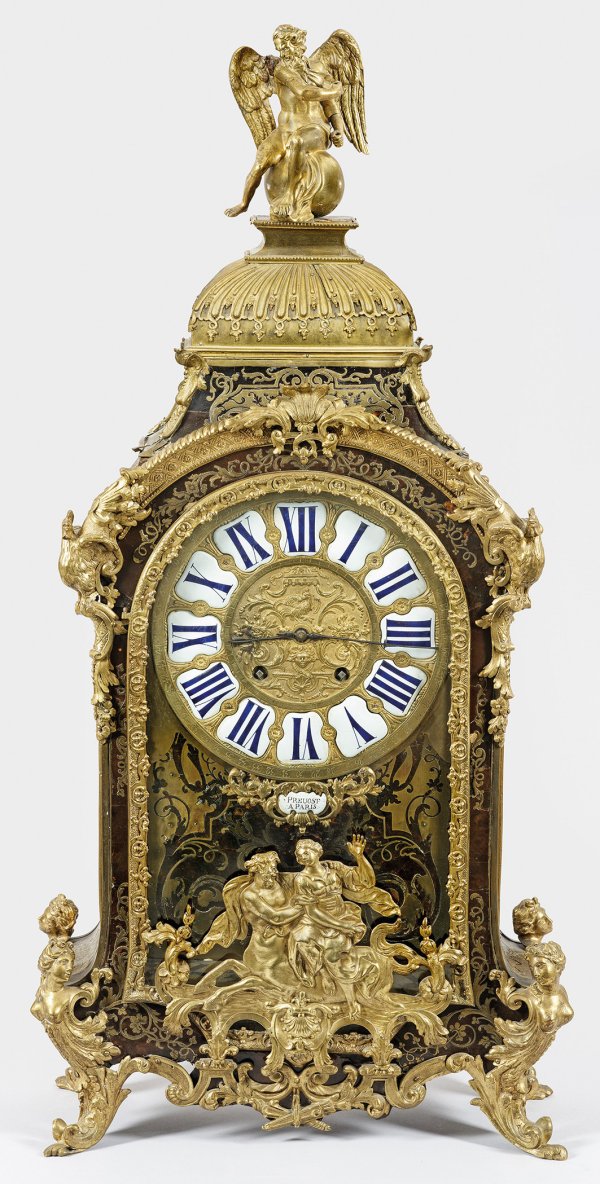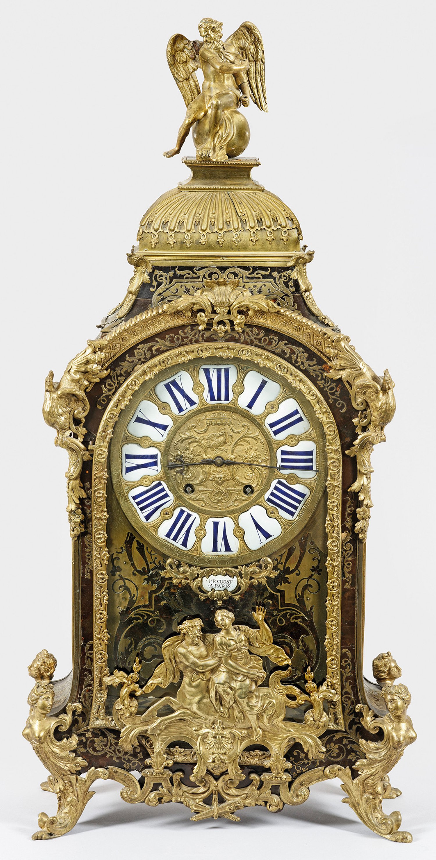 Flächendeckender Fond aus dunklem Horn und ornamentiertem Messing in sog. Boulle-Technik. Applikationen aus Bronze. Hoher, dreiseitig verglaster Korpus, flankiert von plastischen Genienköpfen und Hähnen mit geschweift ansteigendem oberen Abschluss sowie skulpturaler Bekrönung in Gestalt des Chronos. Zifferblatt aus Emailreserven bez. Preuost à Paris. Werk mit Spindelhemmung und Schlagwerk auf Glocke. Pendel fehlt. H. 104 cm.