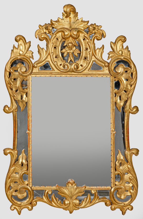 Holz, geschnitzt, gefasst und vergoldet. Hochrechteckige, umlaufend schmal profilierte Spiegelrahmung, flankiert von üppigen, eingerollten Blattvoluten. Korrespondierender oberer Abschluss aus gegeneinander gestellten Rocaillespangen mit Blüte und Blattbekrönung. 111 cm x 70,5 cm.