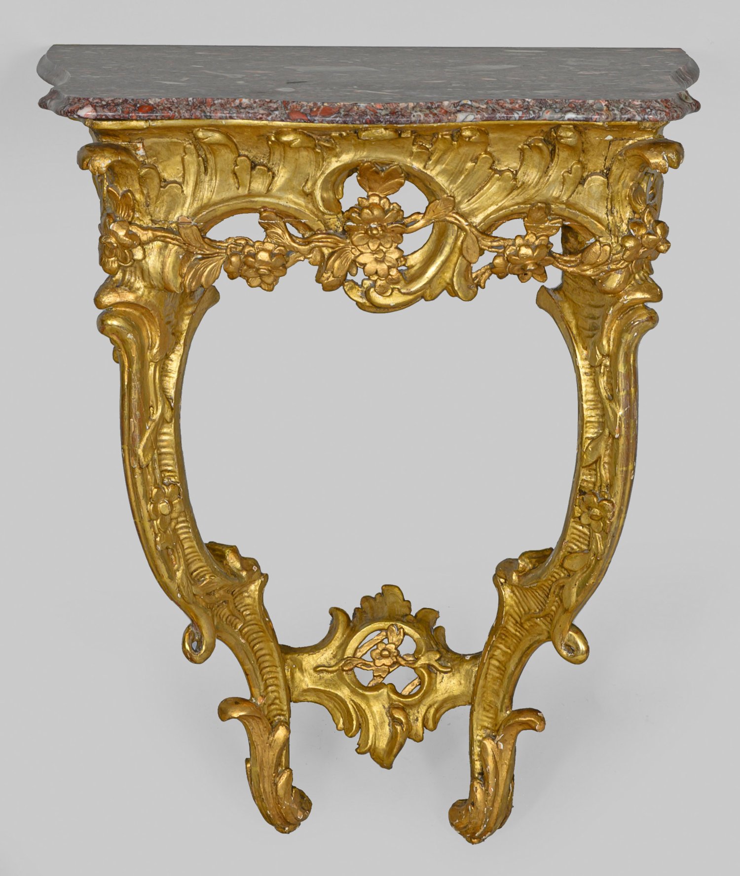 Holz, geschnitzt, gefasst und vergoldet. Durchbrochen gearbeitete, asymmetrisch angelegte Zarge aus üppigen Rocaillen und reliefplastischen Blüten, in korrespondierende, geschwungene Beine aus gestreckten Voluten übergehend. In der Mitte, durchbrochen gearbeite Rocaillekartusche. Erg. gering überstehende Deckplatte aus bordeauxrotem, hellgrau gemasertem Marmor. H. 78 cm. 65 cm x 42 cm.