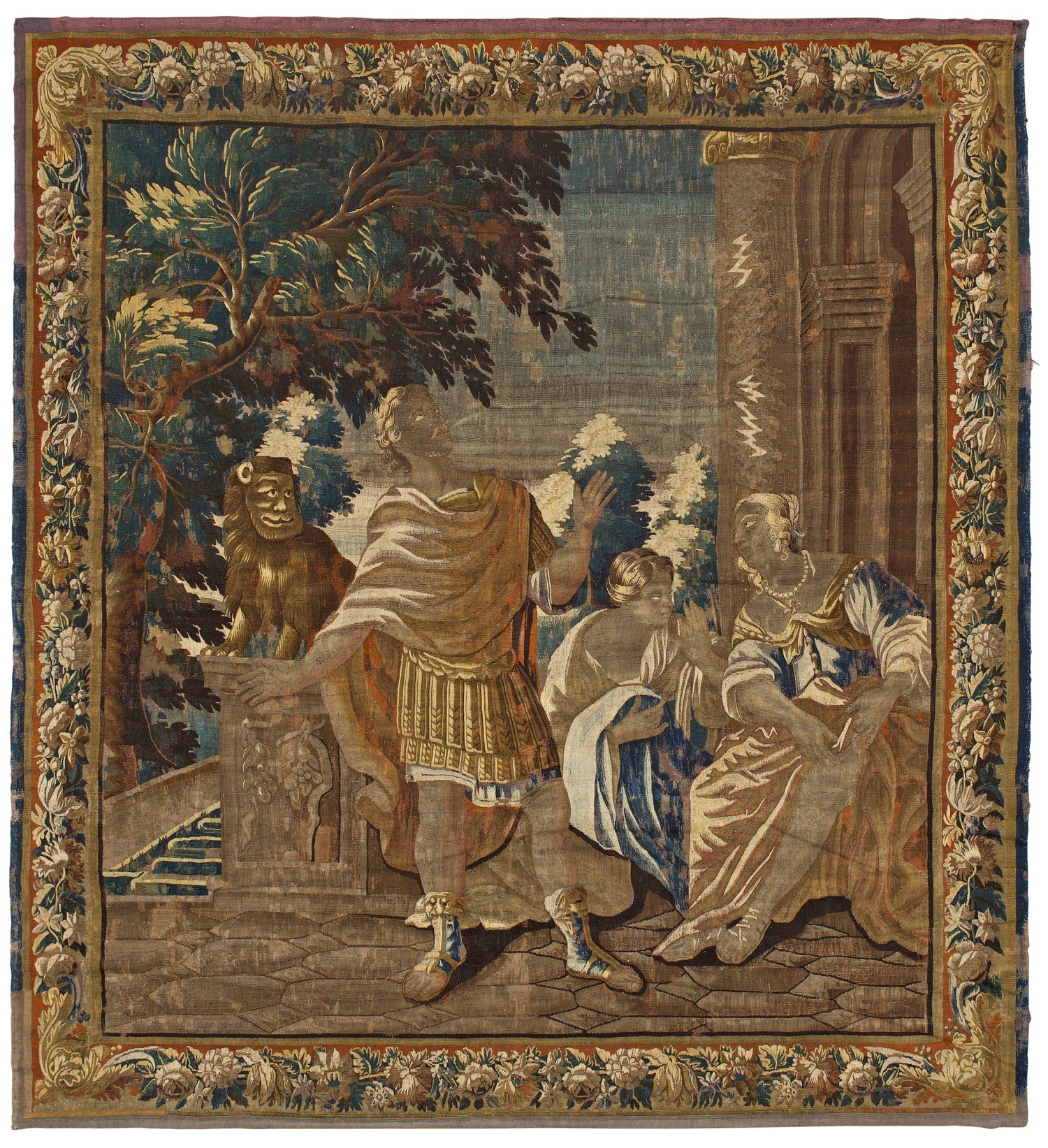 Wolle in unterschiedlichen Braun-, Beige- und Grüntönen, flach gewebt. Im Innenfeld flächendeckende, figurale Darstellung wohl des römischen Feldherrn Scipio Africanus als Sinnbild für ritterliches und tugendhaftes Verhalten, indem er bei der Einnahme der Stadt Carthago Nova auf die schöne Verlobte des keltischen Stammesführers Allucius als Kriegsbeute verzichtete und sie an den Verlobten zurückgab. Im Hintergrund angedeutete Palastarchitektur und Parklandschaft. Umlaufend breite Bordüre mit üppigem Frucht- und Blattdekor. Teilw. rest.; 270 cm x 290 cm.