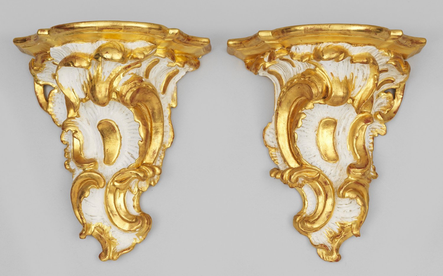 Gegenstücke. Holz, weiß gefasst und teilw. vergoldet. Sich konisch weitendes Wandschild aus üppigen, reliefplastisch gestalteten Rocaillen als Träger für passig geschweifte, profilierte Deckplatte. H. 35 cm. 31 cm x 17,5 cm.