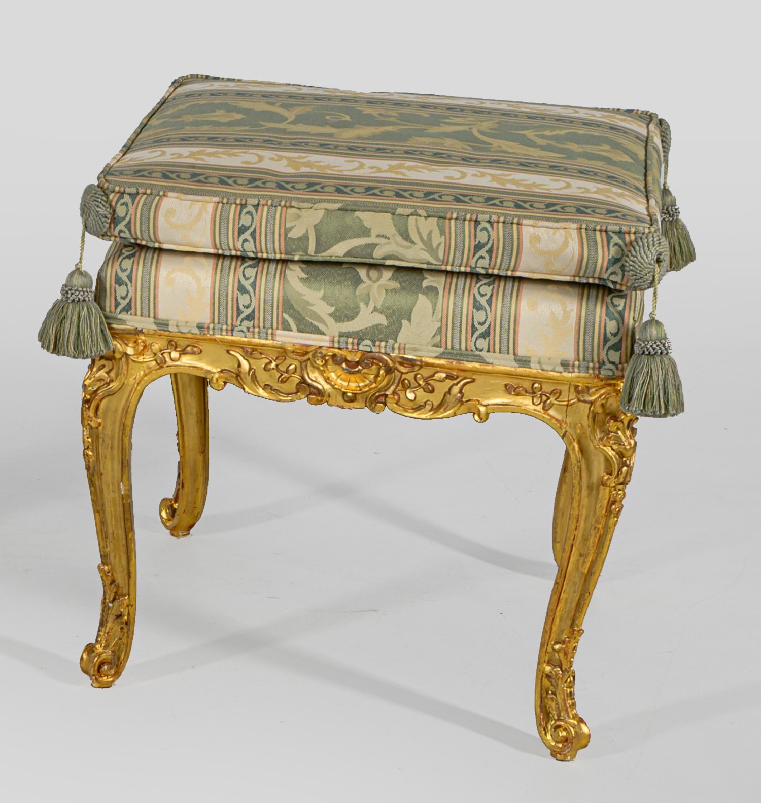 Holz, geschnitzt, gefasst und vergoldet. Passig geschweifte Zarge aus reliefplastisch gestalteten Volutenmotiven, in geschweifte Beine übergehend. Sitzfläche gepolstert und bezogen sowie korrespondierende Kissenauflage mit Quasten. H. 50 cm. 50 cm x 50 cm.