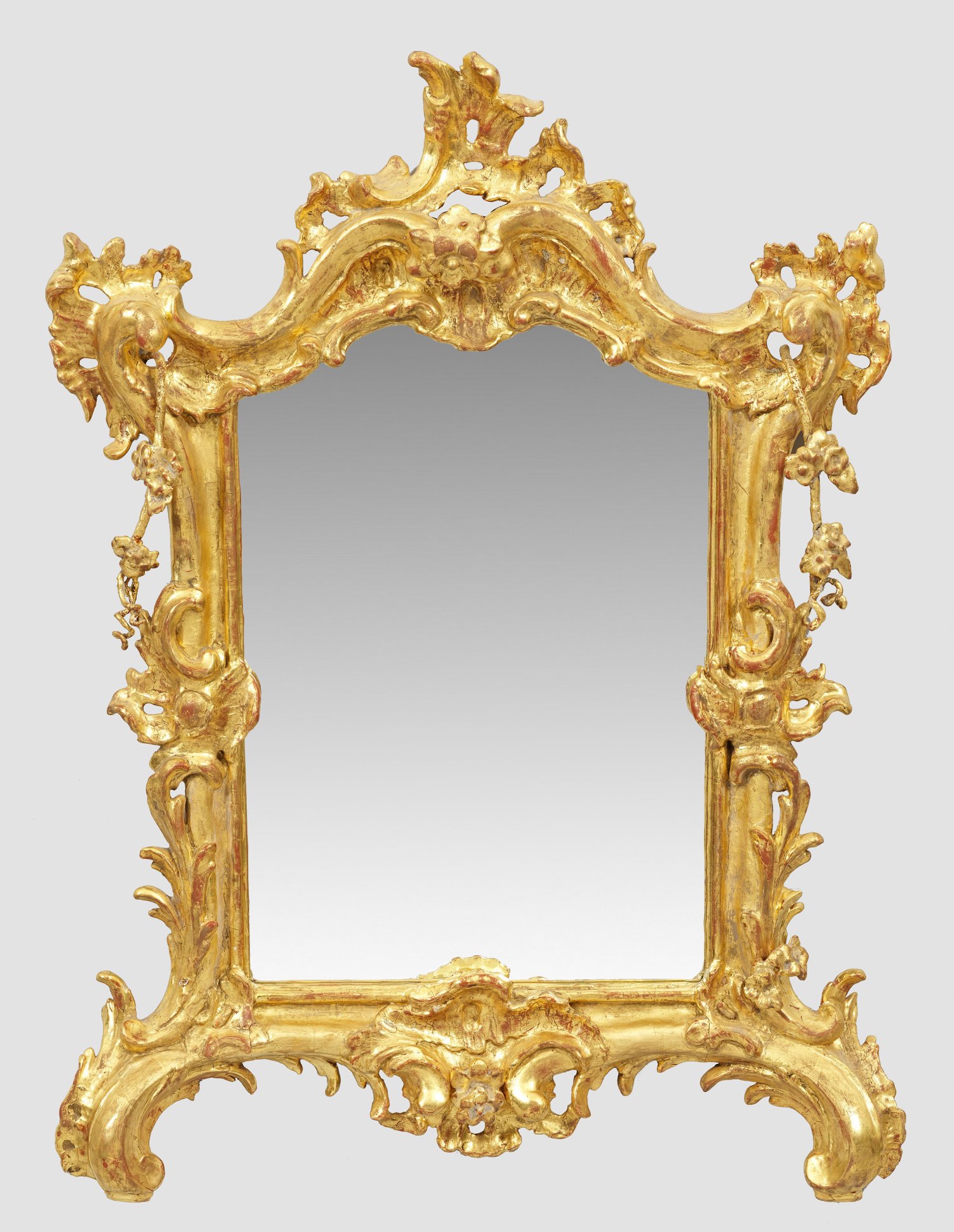 Holz, geschnitzt, gefasst und vergoldet. Hochrechteckige, profilierte Spiegelrahmung aus gestreckten Voluten mit geschweift ansteigendem oberen Abschluss. Durchbrochen gearbeitete, asymmetrisch angelegte Rocaillebekrönung sowie unterer Abschluss aus Volutenstützen. 67 cm x 49 cm.