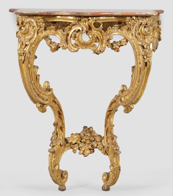Holz, reliefplastisch geschnitzt, gefasst und vergoldet. Passig geschweifte, durchbrochen gearbeitete Zarge aus üppigen Rocaillen, in hohe, stark geschwungene Beine aus gegeneinander gestellten Voluten übergehend. Dazwischen reliefplastischer Steg aus Blattwerk. Fehlstellen. Erg. Deckplatte aus rot gemasertem Marmor. H. 79,5 cm. 68 cm x 36,5 cm.