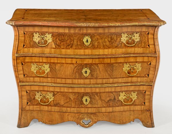 Nussbaum, furniert bzw. teilw. gefasst und vergoldet. sowie Einlagen aus Pflaumenholz. Bombierter, querrechteckig angelegter Korpus, flankiert von ausgezogenen Ecklisenen auf passig geschweifter Zarge. In der gegliederten Front drei breite Schubladen. Korrespondierende, profilierte Deckplatte. Flächendeckende Furnierfelder, von Bandeinlagen begrenzt. H. 80 cm. 115 cm x 63,5 cm.