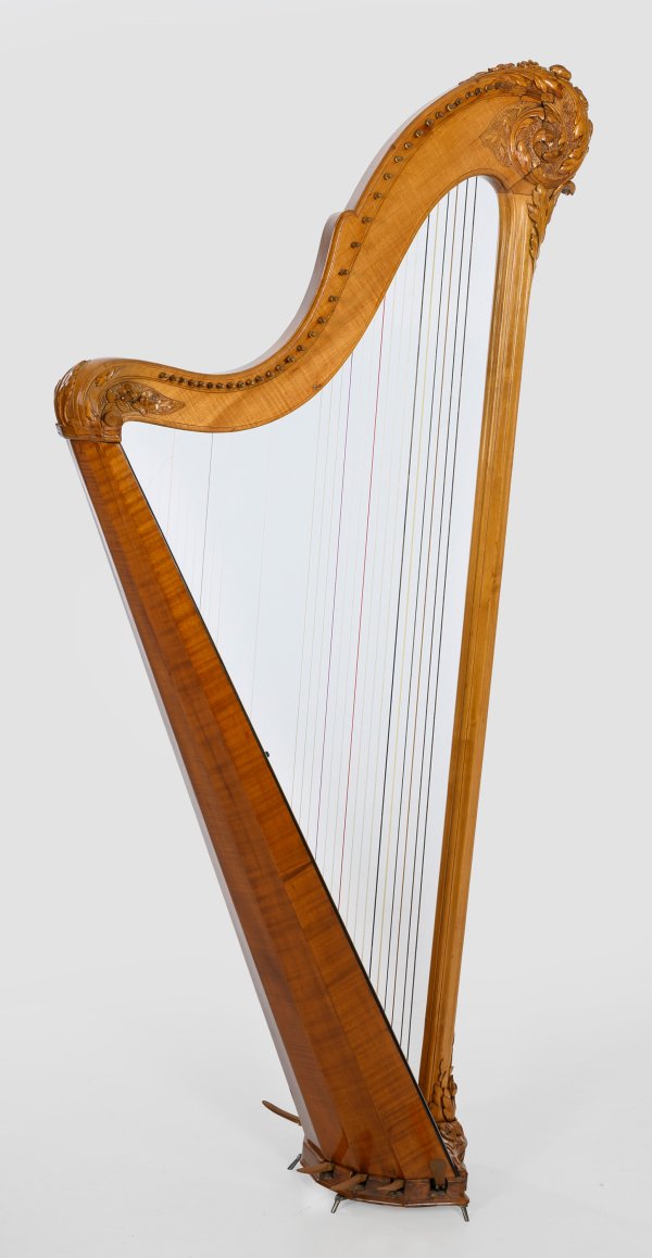 Geriegelter Ahorn furniert sowie teilw. reliefplastisch geschnitzt. Instrument mit schmalen Fußpedalen, 34 Saiten sowie geschnitztem Kopf in Form einer eingerollten Blattvolute. Schlagstempel COUSINEAU A PARIS. Altersspuren. H. 141 cm.