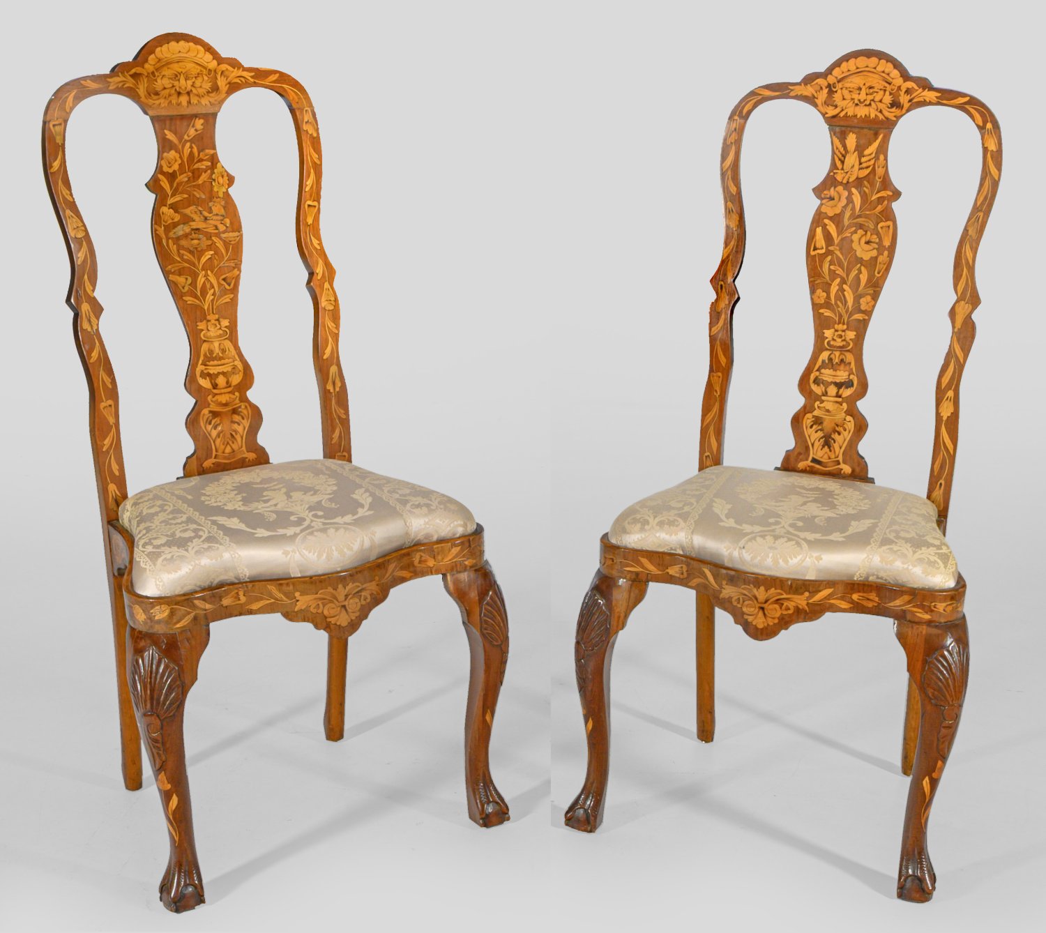 Nussbaum mit Einlagen aus unterschiedlichen Hölzern. Passig geschweifte Zarge auf geschwungenen Beinen. Hohe Rückenlehnenrahmung mit geschweift ansteigendem oberen Abschluss und balusterförmigem Mittelsteg. Sitzfläche gepolstert und bezogen. Sitz-H. 50 cm.