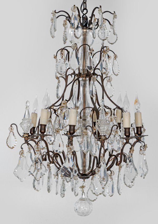 8-flg.; Metall, schwarz lackiert und farbloses Glas. Balusterförmiger, offen gestalteter Korpus aus geschwungenen Streben als Träger für paarweise angeordnete Leuchtmittel und Balusterbekrönungen. Reicher Behang aus facettierten Prismen. Elektrifiziert. H. 86 cm. D. 55 cm.