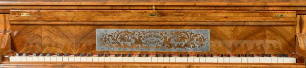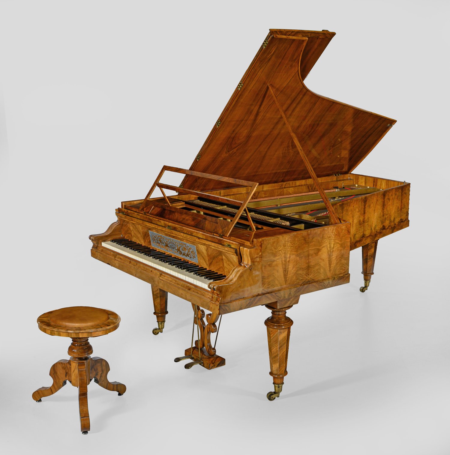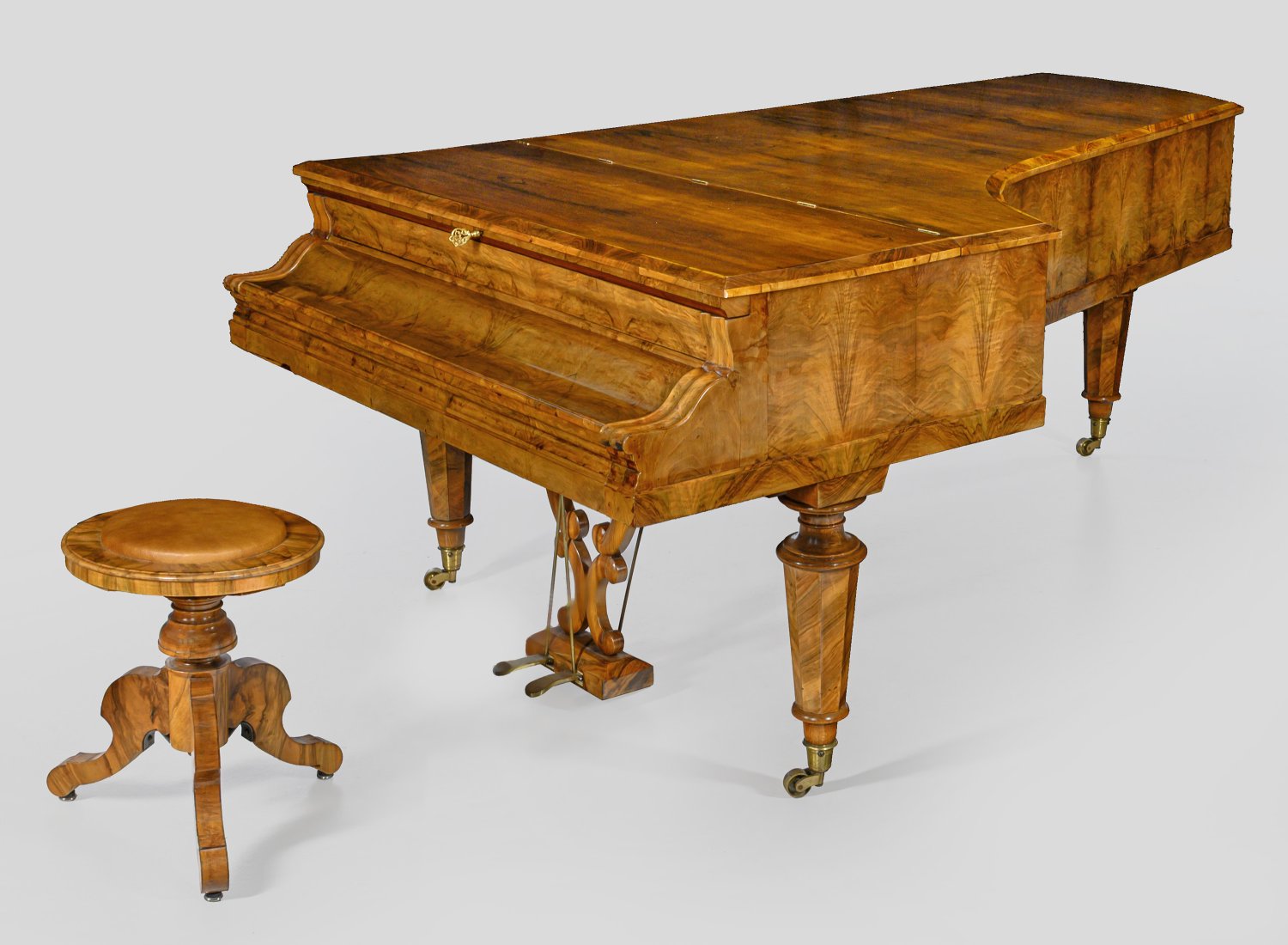 Nussbaum, furniert. Bombierter, gestreckter Korpus auf Balusterbeinen mit Rollen. Leicht überstehende, aufklappbare Deckplatte. Tastatur aus 82 teilw. ebonisierten bzw. mit Knochen belegten Tasten. Darüber aufstellbarer Notenständer. Herstellerzeichen. Überholungsbedürftig. H. 88 cm. 130 cm x 213 cm.