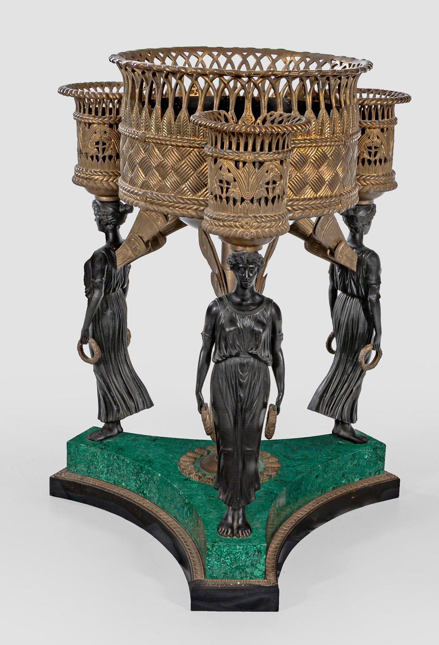 Bronze, teilw. dunkel patiniert sowie flächendeckender Fond aus in unterschiedlichen Grüntönen feingemasertem Malachit, über dreiseitig konkav eingezogener Sockelplatte mit umlaufendem Palmettenfries. Vollplastisch gestaltete Viktorienfiguren und zentraler, leicht konisch verlaufender Balusterschaft als Träger für zylinderförmigen, korbähnlich reliefierten sowie entsprechend durchbrochen gearbeiteten Korpus mit Pflanzeinsatz, flankiert von korrespondierenden Behältnissen. H. 91 cm.