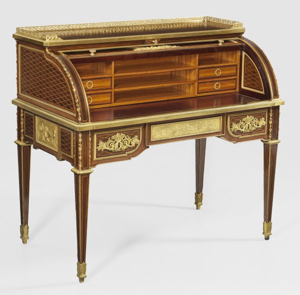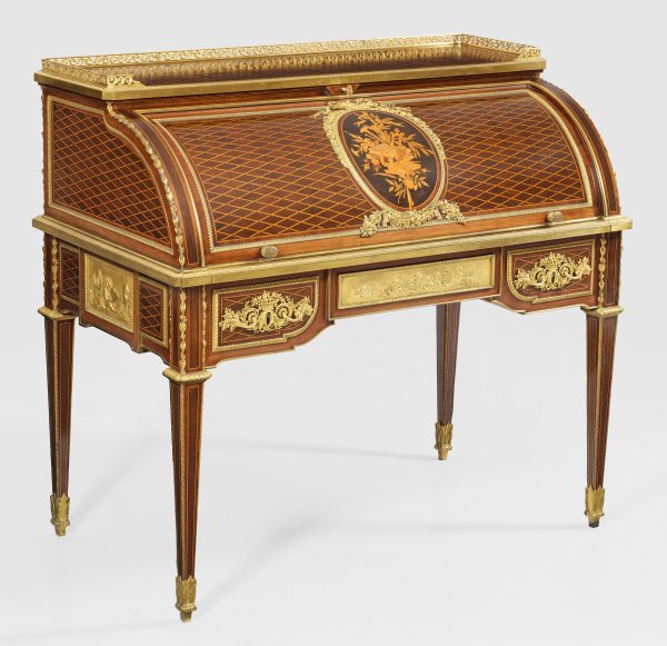 Amaranth und Mahagoni, furniert sowie Einlagen aus unterschiedlichen Edelhölzern und Applikationen aus vergoldeter Bronze. Gerader, querrechteckig angelegter Zargenkasten auf konischen Vierkantbeinen. In der gegliederten Front drei Schubladen unterschiedlicher Größe, mittig mit verstecktem Schließmechanismus. Oberhalb ausziehbare Arbeitsfläche mit goldgeprägter Ledereinlage. Bombierter Zylinderverschluss mit intarsierten Attributen der Musik. Dahinter gestaffelte Facheinteilung. Gering überstehende Deckplatte mit durchbrochen gearbeiteter Galerierahmung aus Volutenmotiven. Allseitig profilgerahmte Furnierfelder aus fein intarsiertem Gitterwerk sowie reliefplastisch gestaltete Reserven mit Puttenszenerien. Seitl. sign. Henry Dasson 1886 sowie entsprechende Schlagstempelsign.; H.104 cm. 113 cm x 64 cm.