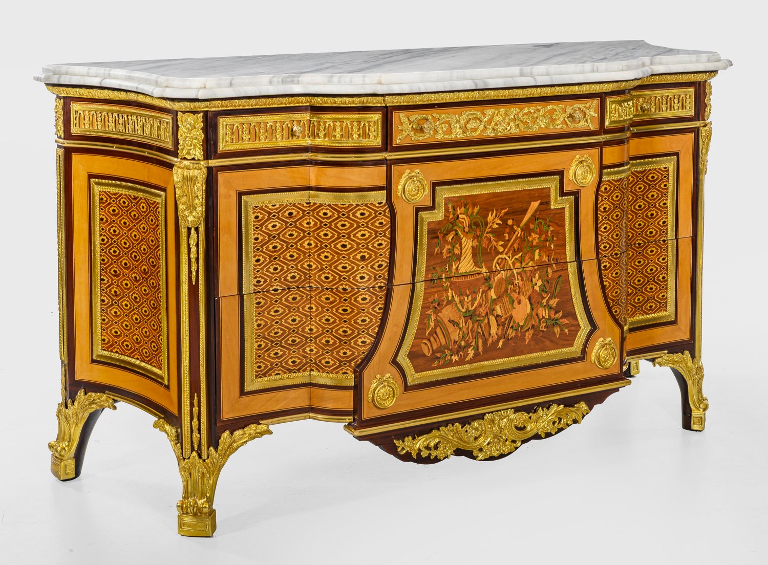 Nussbaum und Buchenholz, furniert sowie Marketerie aus unterschiedlichen, teilw. gefärbten Hölzern. Querrechteckig angelegter, seitlich konkav eingezogener Korpus, flankiert von schräggestellten Ecklisenen auf Blattvoluten. In der gegliederten Front fünf Schubladen unterschiedlicher Größe. Flächendeckend profilgerahmte Felder aus blütengefüllter Rautenmarketerie sowie schauseitig intarsiertes Stillleben aus Vasenmotiven, Früchten und Blüten. Reiche Applikationen aus vergoldeter Bronze. Korrespondierende Deckplatte aus weißem Marmor. H. 96 cm. 175 cm x 68 cm.