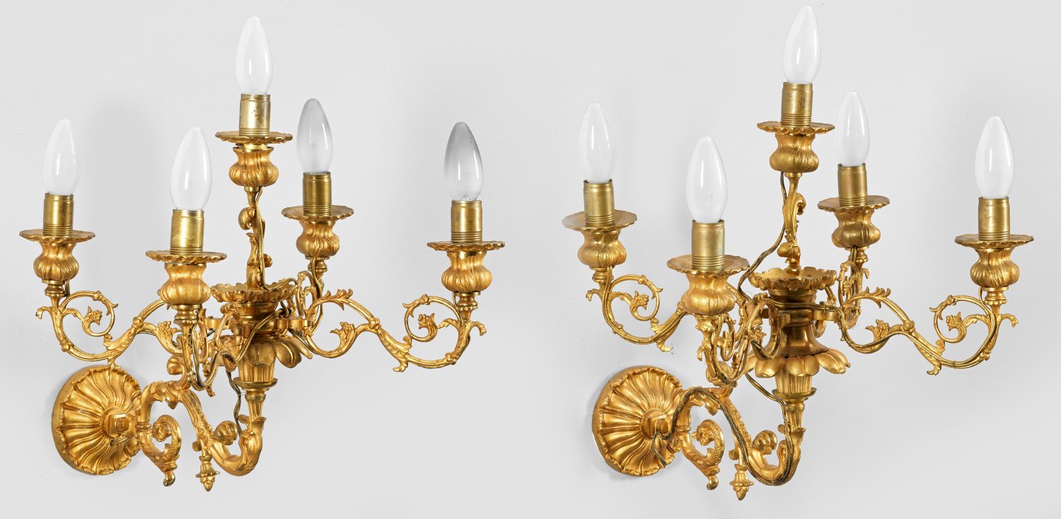 5-flg.; Bronze, vergoldet. Rosettenförmiges Wandschild. Mittig davon ausgehend stark geschwungener Leuchterarm mit stilisiertem Delfin. Oberhalb korrespondierendes Girandolenelement aus eingerollten Voluten mit vasenförmigen Tüllen als Träger für Leuchtmittel. Rep.; Nachträglich elektrifiziert. Ges.-H. 45 cm.